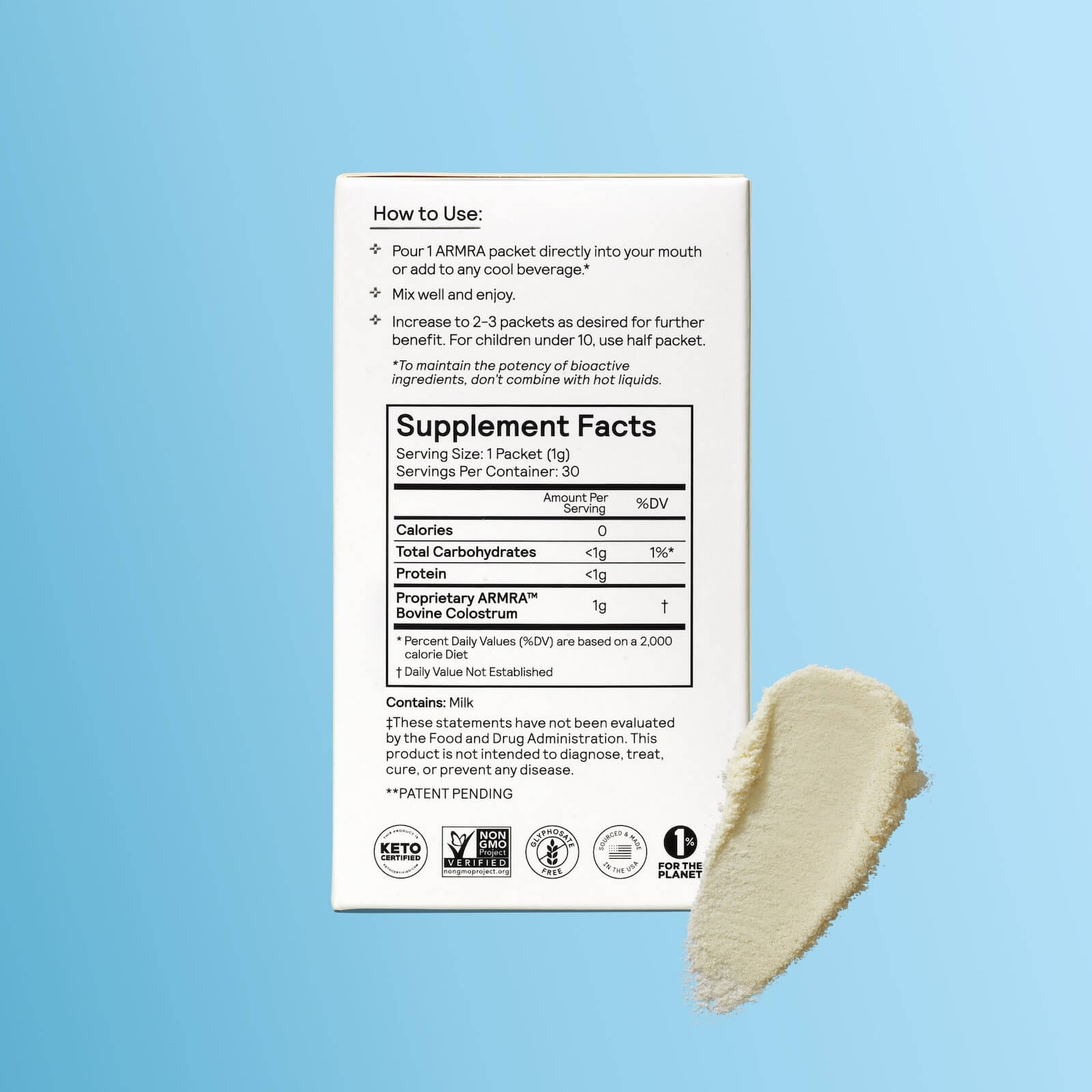 Unflavored: Proprietary ARMRA Colostrum" Concentrate (Bovine). Contains: Milk.